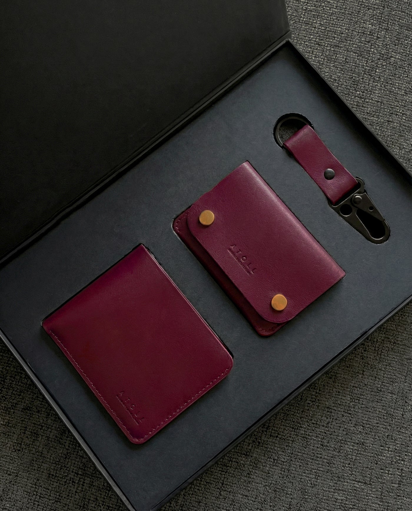 One Petra Burgundy wallet + One Abel Burgundy Bifold + One Burgundy Keychain
