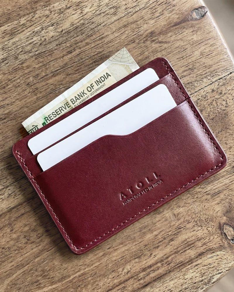This piece is handcrafted in Top Grain Leather, Ideal for Every day carry. It has 3 card slots followed by a Centre compartment for folded cash, Bills.